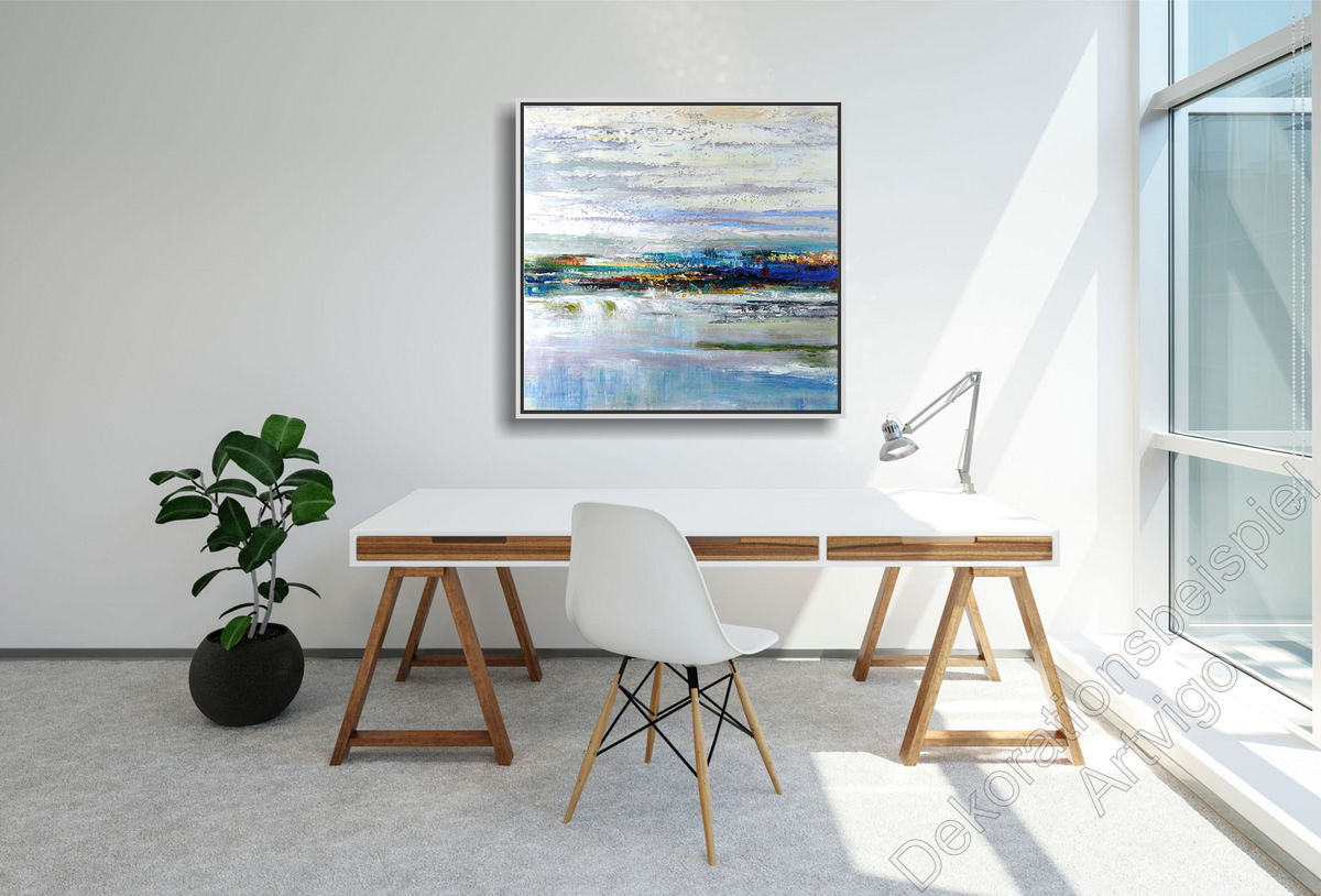 Dieses atmosphärische Ölgemälde im Format 80x80 cm ist Teil einer ausdruckstarken Kunstserie und zeigt eine faszinierende abstrakte Küsten- oder Seelandschaft. Das Werk besticht durch seine mehrschichtige, komplexe Komposition und die meisterhafte Balance zwischen Ruhe und Bewegung.
