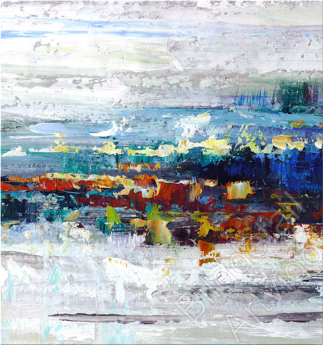 Dieses atmosphärische Ölgemälde im Format 80x80 cm ist Teil einer ausdruckstarken Kunstserie und zeigt eine faszinierende abstrakte Küsten- oder Seelandschaft. Das Werk besticht durch seine mehrschichtige, komplexe Komposition und die meisterhafte Balance zwischen Ruhe und Bewegung.