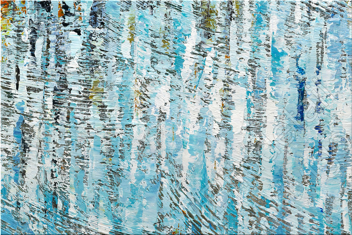 Die Farbigkeit wird von kühlen Blau-, Türkis- und Grüntönen dominiert, durchsetzt von weißen Aufhellungen, die dem Werk Leichtigkeit und Weite geben. Akzente in Gelb, Orange, Rot und Schwarz sorgen für Spannung und Tiefe – wie kurze Lichtblitze oder Reflexe im Fluss des Bildes.