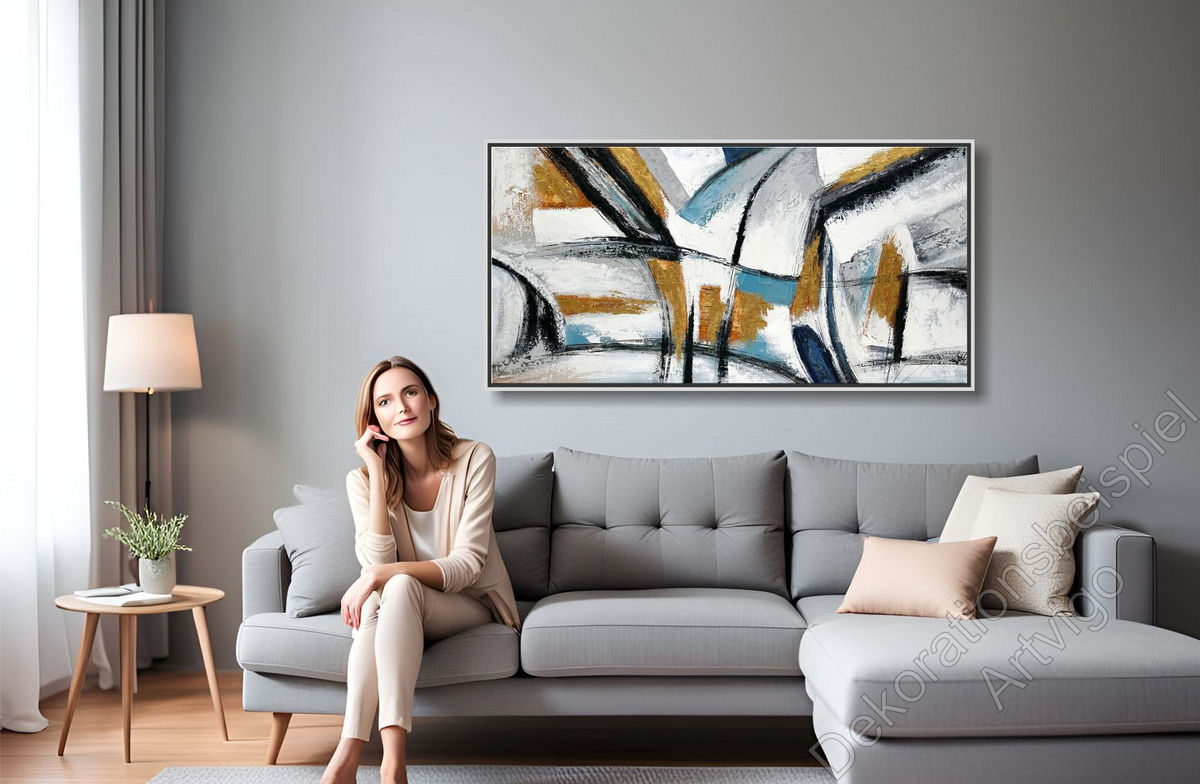 Dieses ausdrucksstarke Ölgemälde im Querformat besticht durch seine dynamische Komposition aus geometrischen Formen und expressiven Pinselstrichen. Die Farbpalette vereint edle Goldtöne mit kühlem Türkis, tiefem Schwarz und sanften Grautönen, die durch großzügige weiße Flächen aufgelockert werden. Kräftige schwarze Linien und Konturen strukturieren die Komposition und verleihen ihr architektonische Präsenz. Die pastose Maltechnik mit sichtbaren Pinselspuren erzeugt eine lebendige Oberflächenstruktur. Die Verschmelzung von abstrakter Expressivität und geometrischer Ordnung schafft ein faszinierendes Spannungsfeld. Goldene Akzente setzen luxuriöse Highlights und verleihen dem Werk eine besondere Eleganz. Perfekt für moderne Wohnräume, die zeitlose Ästhetik suchen.
