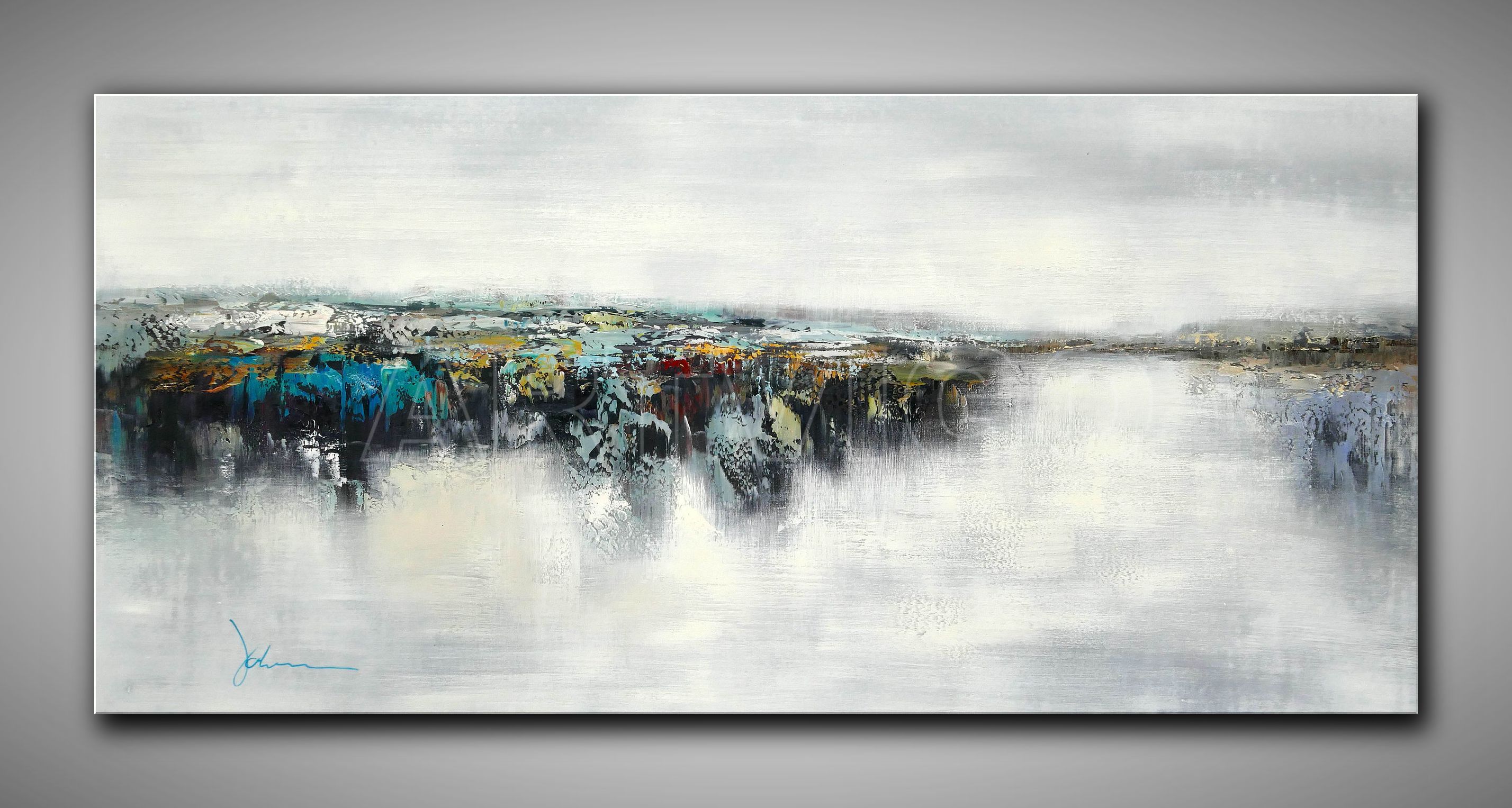 Dieses atmosphärische Ölgemälde von Johanson entfaltet auf 150 x 75 cm eine poetische Landschaftsinterpretation zwischen Abstraktion und Gegenständlichkeit. Das Werk wird von einer subtilen, nebelverhangenen Stimmung dominiert, in der zarte Grau-, Weiß- und Beigetöne die Grundtonalität bilden. Im mittleren Bildbereich entwickelt sich ein intensiver Farbakkord aus Türkis, dunklen Grün- und Schwarztönen, akzentuiert durch leuchtende Gelb- und Rottupfer. Die Komposition erinnert an eine Küstenlandschaft, wobei die obere Hälfte einen weiten, dunsigen Himmel andeutet, während der zentrale Bereich wie eine felsige Klippe oder dichte Vegetation erscheint. Charakteristisch sind die fließenden Farbverläufe, lasierenden Schichten und tropfenden Farbspuren, die dem Panorama eine meditative, zeitlose Qualität verleihen.