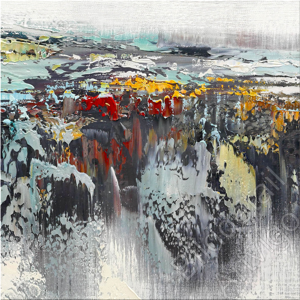 Das Gemälde zeigt eine atmosphärische Komposition, die an eine nebelverhangene Küstenlandschaft erinnert. Die subtile Farbpalette aus Grau-, Weiß- und Beigetönen wird durch intensive Türkis-, Grün- und Schwarzakzente im Zentrum belebt, ergänzt durch leuchtende Gelb- und Rottupfer. Charakteristisch sind die fließenden Farbverläufe, transparenten Lasuren und kontrollierten Tropfspuren, die dem Werk Tiefe und Dynamik geben.