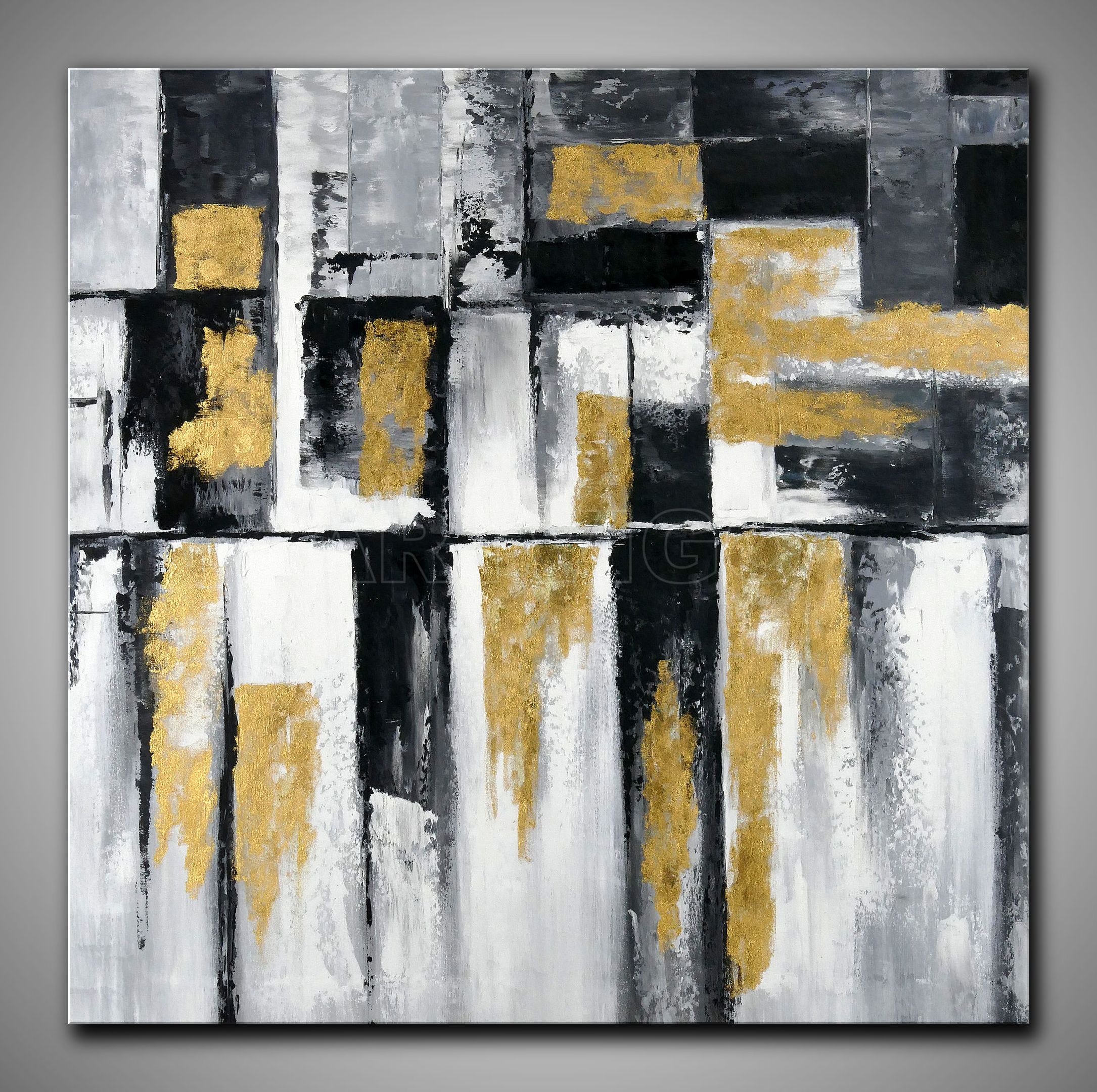 Das Gemälde besticht durch seine luxuriöse Farbgebung mit edlen Goldtönen, die mit Schwarz, Weiß und Graunuancen kontrastieren. Die geometrische Komposition verbindet urbane Ästhetik mit künstlerischer Ausdruckskraft und passt hervorragend zu modernen und klassischen Einrichtungsstilen.