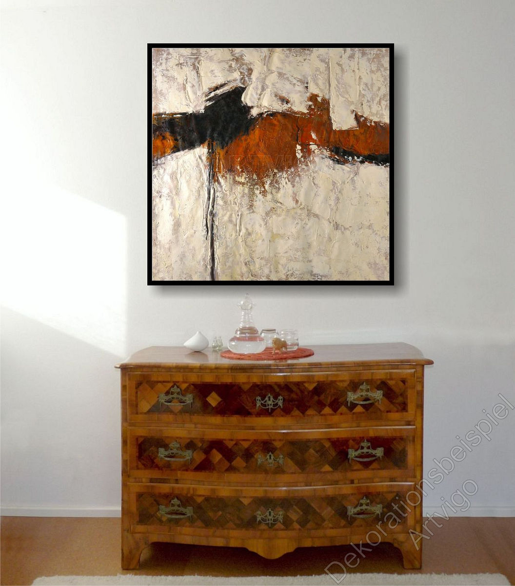 Das Gemälde zeichnet sich durch seine warme Farbpalette aus Creme, Beige, Rost, Orange, Terrakotta und erdigen Brauntönen aus, akzentuiert durch dramatische schwarze Elemente. Die stark strukturierte Oberfläche wurde mit Spachteln und speziellen Maltechniken geschaffen und verleiht dem Werk eine dreidimensionale, archaische Anmutung. Die Komposition erinnert an geologische Schichten, mediterrane Landschaften oder antike Mauern und strahlt zeitlose Eleganz aus.
