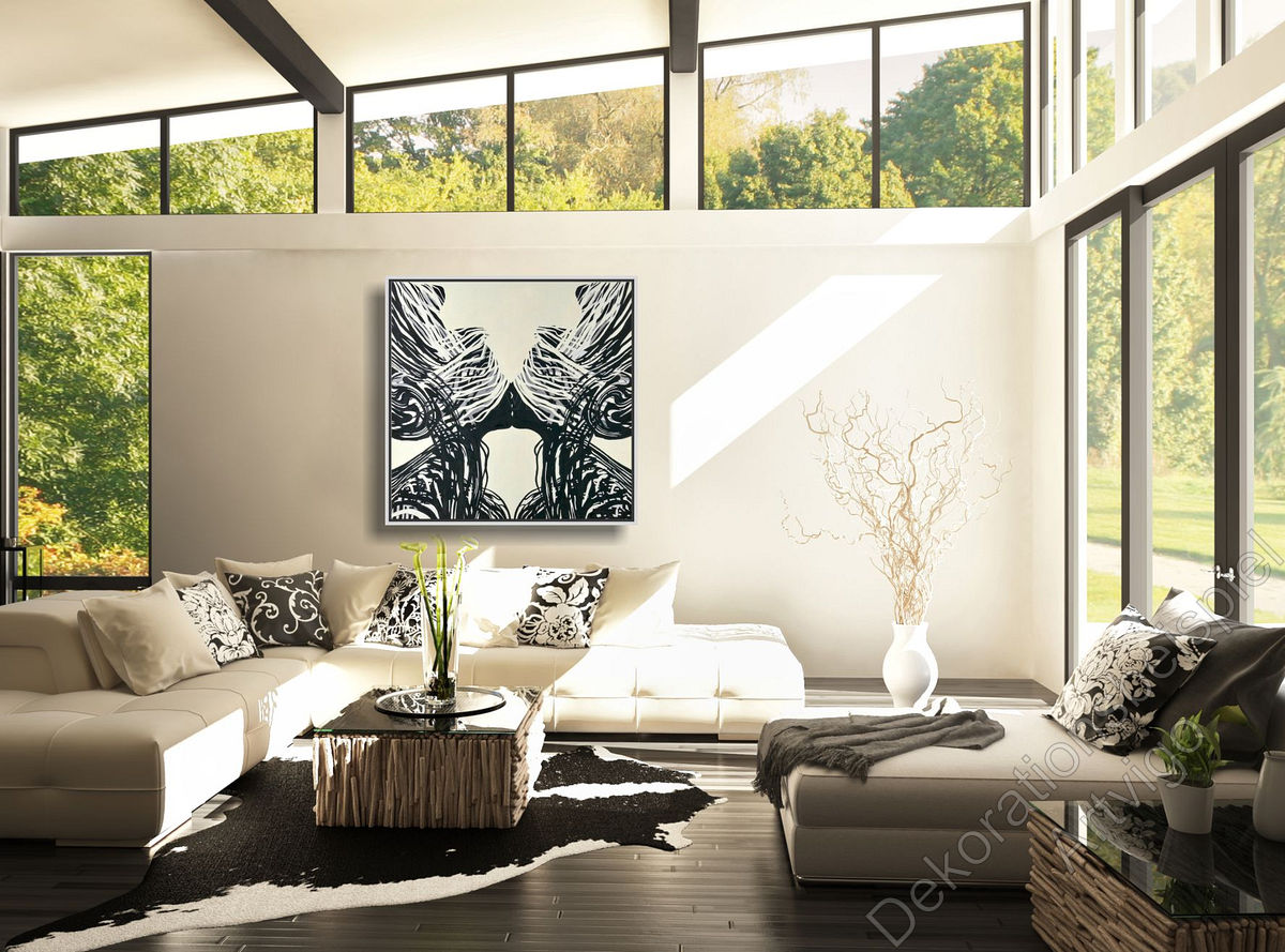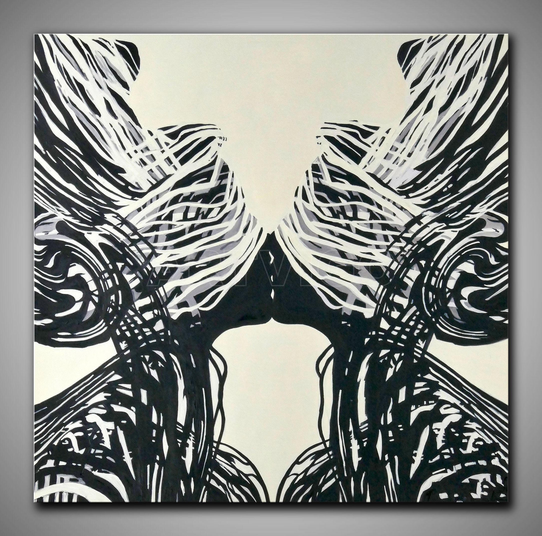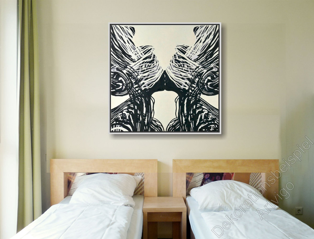 Dieses faszinierende abstrakte Ölgemälde im Format 100 x 100 cm besticht durch seine kraftvolle Schwarz-Weiß-Komposition mit dramatischer Symbolik. Das Werk zeigt zwei spiegelbildlich angelegte Figuren, die sich in der Bildmitte zu begegnen scheinen – ein intimer Moment der Verbindung. Die Gestalten sind aus dynamischen, fließenden Linien und Schwüngen gebildet, die an Haare, Flügel oder Gewänder erinnern. Die expressive Pinselführung erzeugt einen Wirbel aus schwarzen und weißen Strichen, die sich ineinander verflechten und eine fast hypnotische Bewegung suggerieren. Der helle, ruhige Hintergrund kontrastiert wirkungsvoll mit den intensiven schwarzen Formen und lässt die zentrale Begegnung in den Fokus rücken. Graue Zwischentöne schaffen subtile Übergänge und verleihen der Komposition zusätzliche Tiefe. Ein emotional aufgeladenes Kunstwerk voller Energie und Poesie.