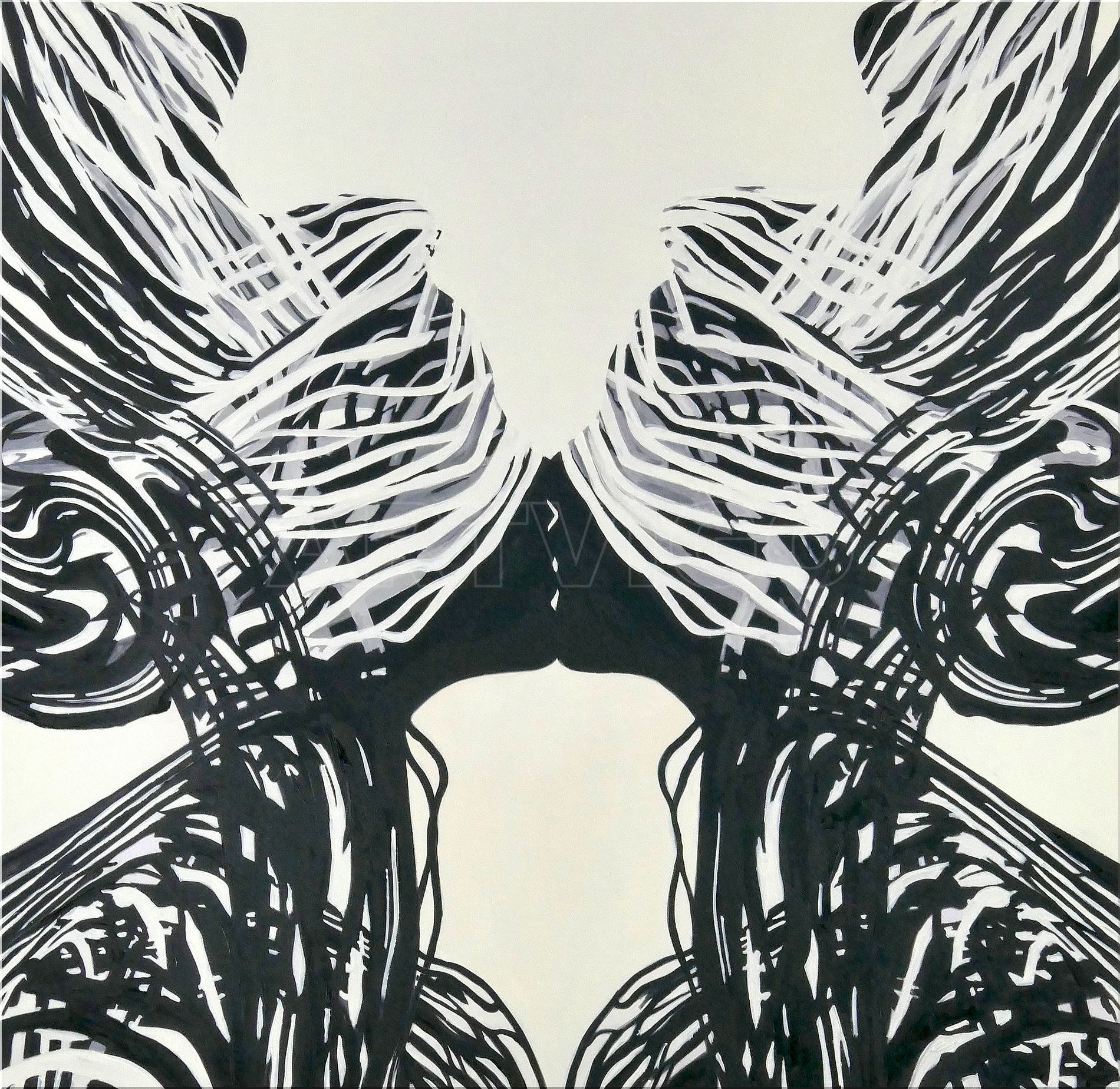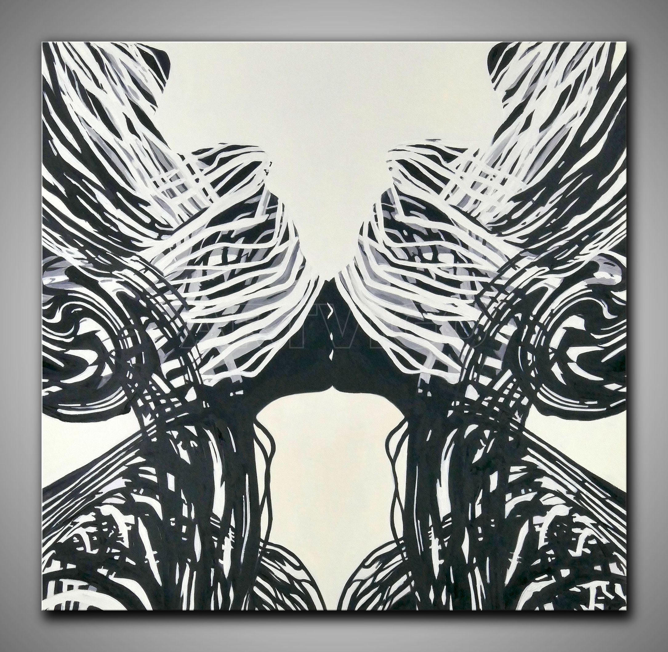 Dieses faszinierende abstrakte Ölgemälde im Format 100 x 100 cm besticht durch seine kraftvolle Schwarz-Weiß-Komposition mit dramatischer Symbolik. Das Werk zeigt zwei spiegelbildlich angelegte Figuren, die sich in der Bildmitte zu begegnen scheinen – ein intimer Moment der Verbindung. Die Gestalten sind aus dynamischen, fließenden Linien und Schwüngen gebildet, die an Haare, Flügel oder Gewänder erinnern. Die expressive Pinselführung erzeugt einen Wirbel aus schwarzen und weißen Strichen, die sich ineinander verflechten und eine fast hypnotische Bewegung suggerieren. Der helle, ruhige Hintergrund kontrastiert wirkungsvoll mit den intensiven schwarzen Formen und lässt die zentrale Begegnung in den Fokus rücken. Graue Zwischentöne schaffen subtile Übergänge und verleihen der Komposition zusätzliche Tiefe. Ein emotional aufgeladenes Kunstwerk voller Energie und Poesie.