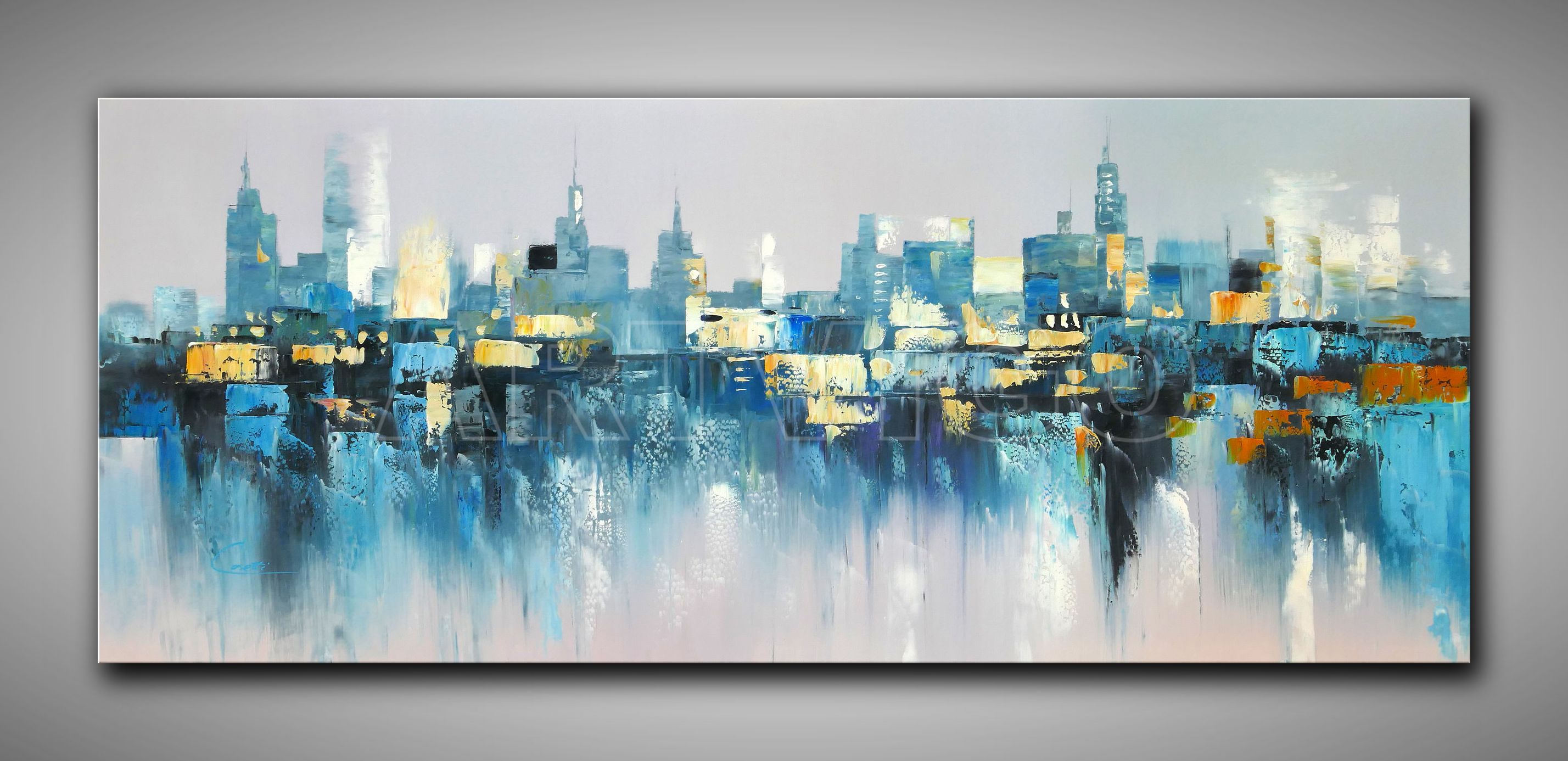 Dieses beeindruckende Panorama-Ölgemälde von Casetti entfaltet auf 150 x 60 cm eine abstrakt interpretierte Großstadtskyline in einer eleganten Blau-Gold-Symphonie. Die Silhouette einer pulsierenden Metropole erhebt sich aus einem diffusen Grau-Weiß, wobei charakteristische Hochhäuser und Türme in zarten Türkis- und Stahlblautönen angedeutet werden. Leuchtende Gold- und Ocker-Akzente evozieren erleuchtete Fenster und urbanes Nachtleben. Die untere Bildhälfte löst sich in fließende, tropfende Farbspuren auf, die wie eine spiegelnde Wasseroberfläche wirken und der Stadt ihren Reflex verleihen. Die atmosphärische Verschmelzung von Skyline und Spiegelung, von Realität und Abstraktion, schafft eine magische Zwischenwelt aus Licht, Farbe und ruhiger Energie.