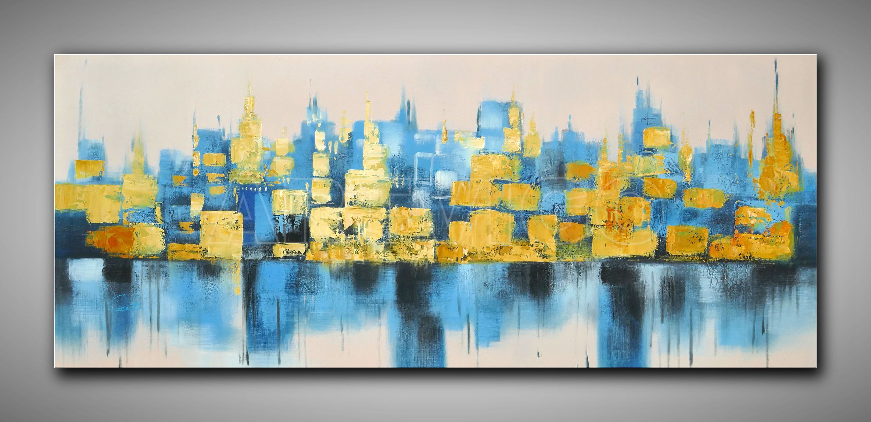 Das Gemälde zeigt eine abstrakt interpretierte Metropolen-Skyline in einer eleganten Farbpalette aus Türkis, Stahlblau und Gold. Die charakteristischen Hochhäuser und Türme schimmern in zartem Blau vor hellem Hintergrund, während leuchtende Gold- und Ockertöne erleuchtete Fenster und urbane Energie erzeugen. Die untere Bildhälfte löst sich in fließende Farbspuren auf, die eine magische Wasserspiegelung andeuten und dem Werk Tiefe und Bewegung verleihen.