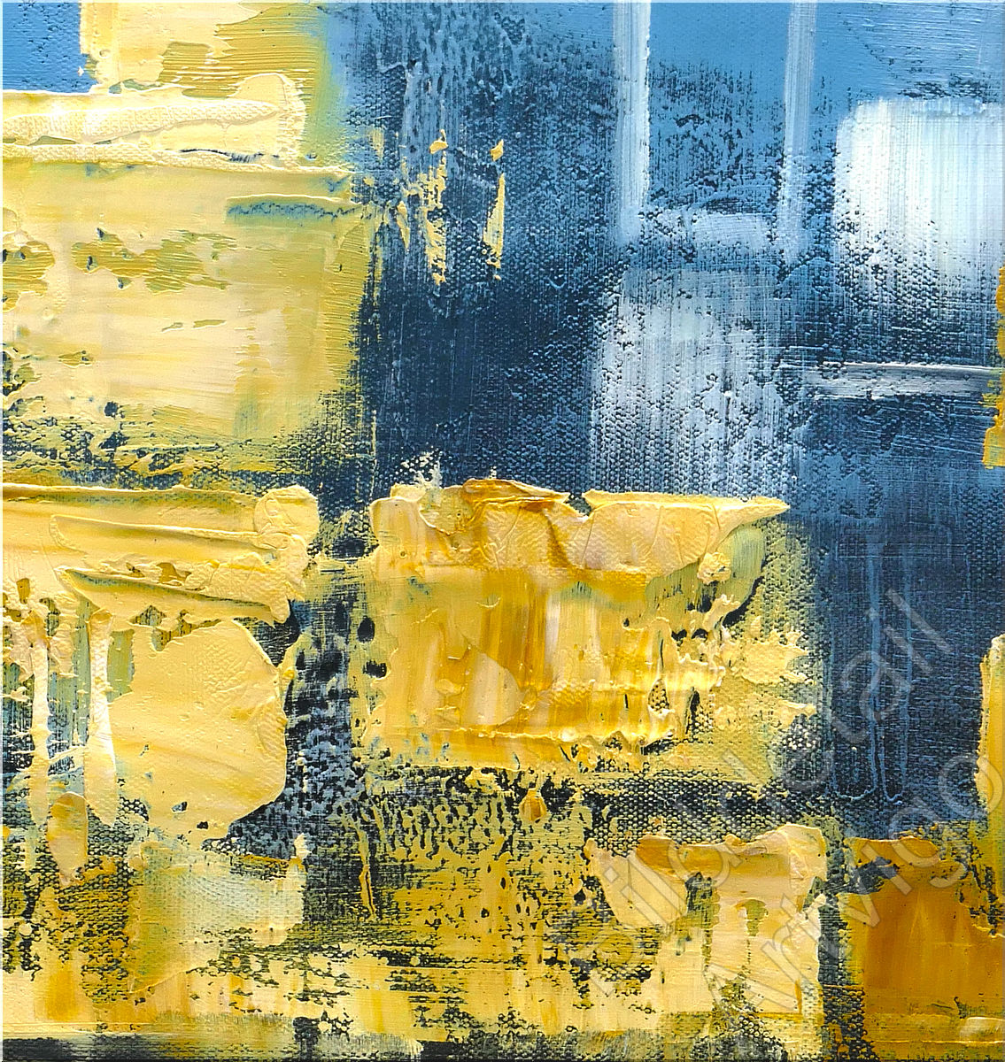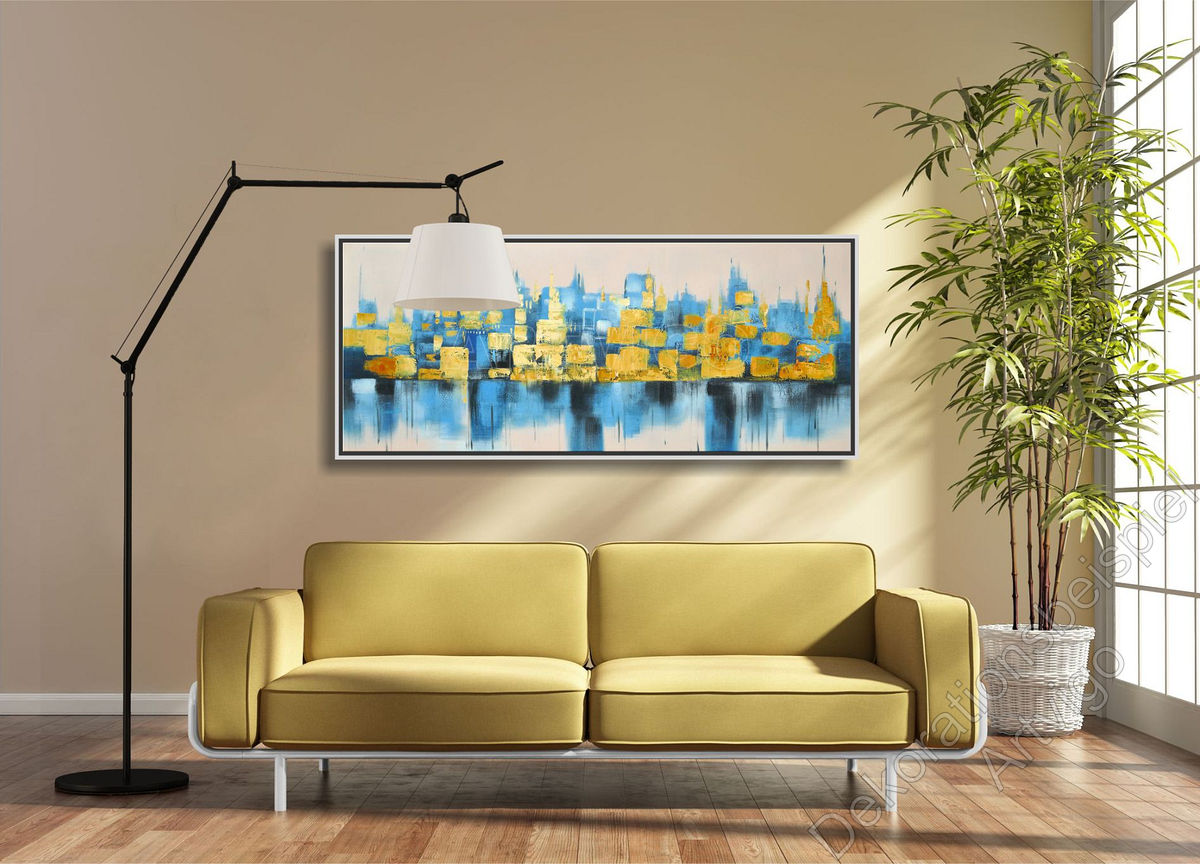 Dieses leuchtende Panorama-Ölgemälde von Casetti präsentiert auf 150 x 60 cm eine strahlende Stadtsilhouette in kraftvoller Blau-Beige-Komposition. Die abstrakt interpretierte Skyline erstrahlt in intensiven Gelb-, Beige- und Orangetönen, die die warme Atmosphäre einer von der Sonne beschienenen Metropole einfangen. Kontrastierend dazu setzen kühle Blau- und Türkistöne architektonische Akzente und schaffen räumliche Tiefe. Die untere Bildhälfte zeigt eine eindrucksvolle Wasserspiegelung in dunklem Petrol und hellem Azur, durchzogen von vertikalen Farbspuren, die wie Lichtreflexe auf bewegtem Wasser wirken. Der helle, cremefarbene Hintergrund verstärkt die Leuchtkraft der Farben und verleiht dem Werk eine luftige, fast schwebende Qualität. Dieses harmonische Spiel aus urbaner Energie und malerischer Poesie erzeugt eine optimistische, lebendige Ausstrahlung.