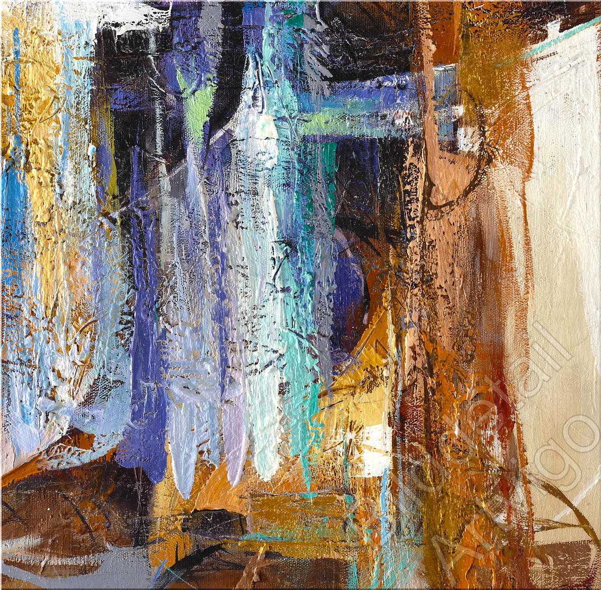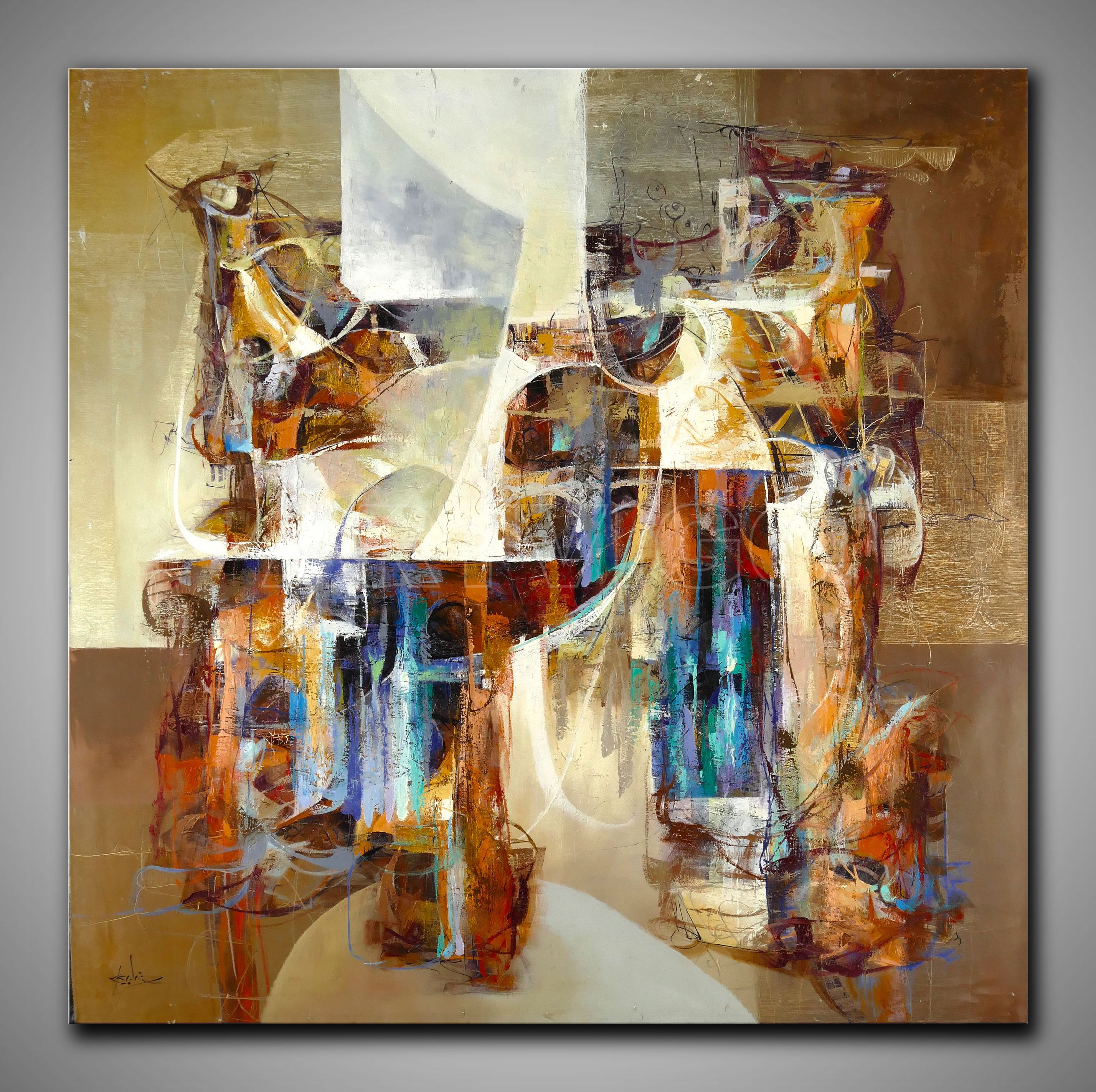 Dieses monumentale abstrakte Ölgemälde von Americo Ccala entfaltet auf 118 x 118 cm eine kraftvolle figurative Komposition, die an Bewegung und rituelle Tänze erinnert. Drei stilisierte, langgestreckte Figuren dominieren die vertikale Bildarchitektur, ihre Körper in fragmentierte Farbflächen und geometrische Muster aufgelöst. Die warme Farbpalette aus Gold-, Ocker-, Orange- und Brauntönen wird durch intensive Türkis-, Blau- und Violettakzente kontrastiert, während Weiß das verbindend Element bildet. Charakteristisch sind die vielschichtigen Überlagerungen, grafischen Linienstrukturen und die dynamische Spannung zwischen erkennbaren figurativen Elementen und abstrakter Auflösung. Die erdigen Hintergrundtöne schaffen einen warmen, organischen Rahmen. Das Werk vermittelt rhythmische Bewegung, kulturelle Tiefe und eine archaische Energie, die Tradition und Moderne vereint.