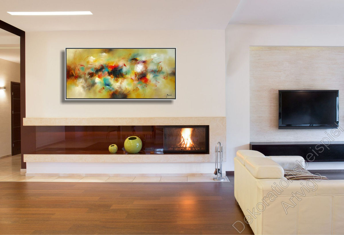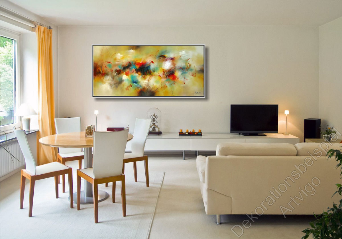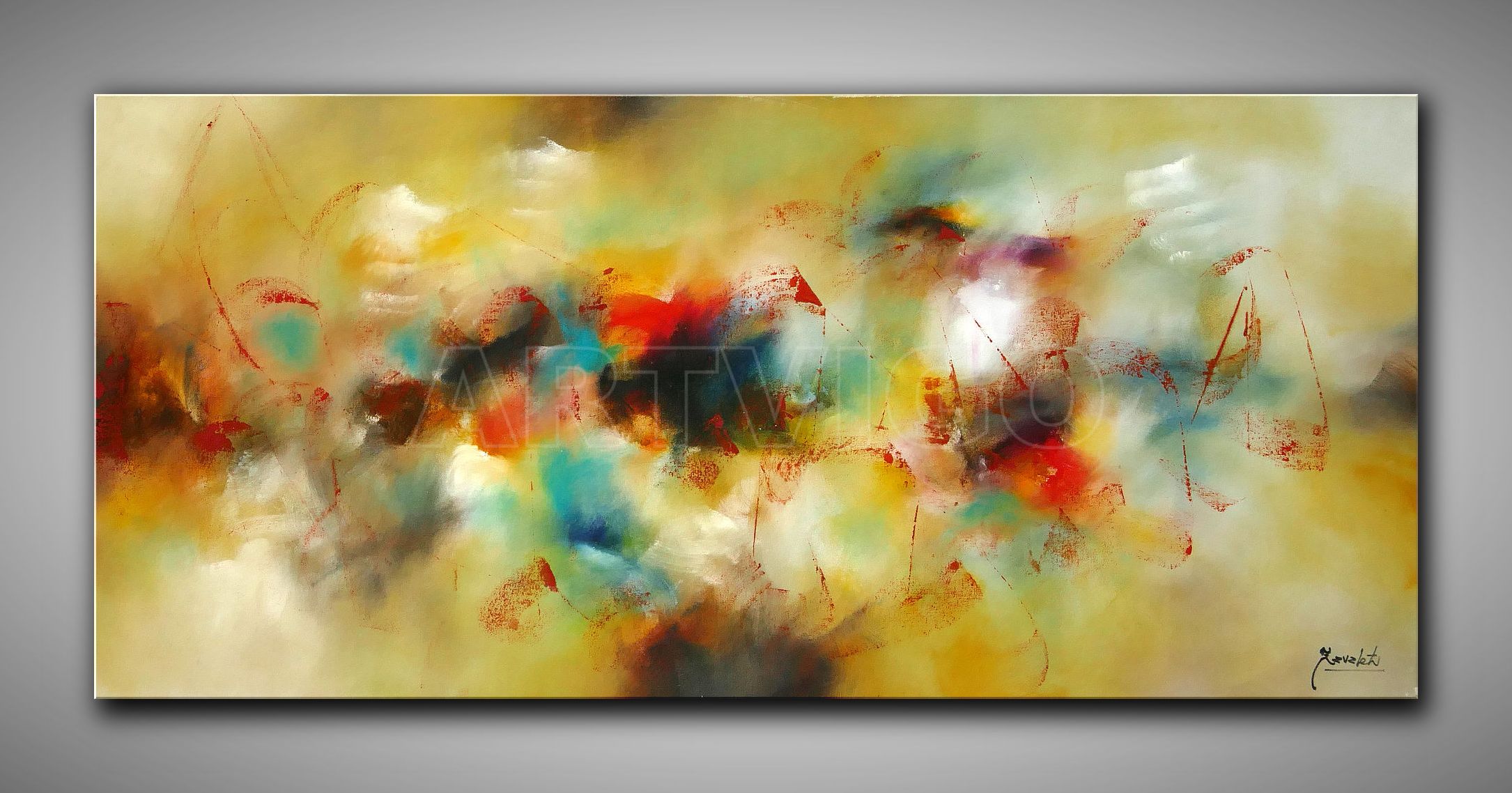 Das großformatige Ölgemälde (65 x 145 cm) von Leonidas Zavaleta entfaltet eine dichte, abstrakte Komposition, die zwischen energetischem Chaos und meditativer Harmonie schwingt. Auf einem überwiegend gelb-grünen und ockerfarbenen Grund entfalten sich lebendige Farbzonen in Rot, Gelb, Blau und Schwarz – teils diffus ineinander fließend, teils in scharfen, gestischen Akzenten gesetzt.