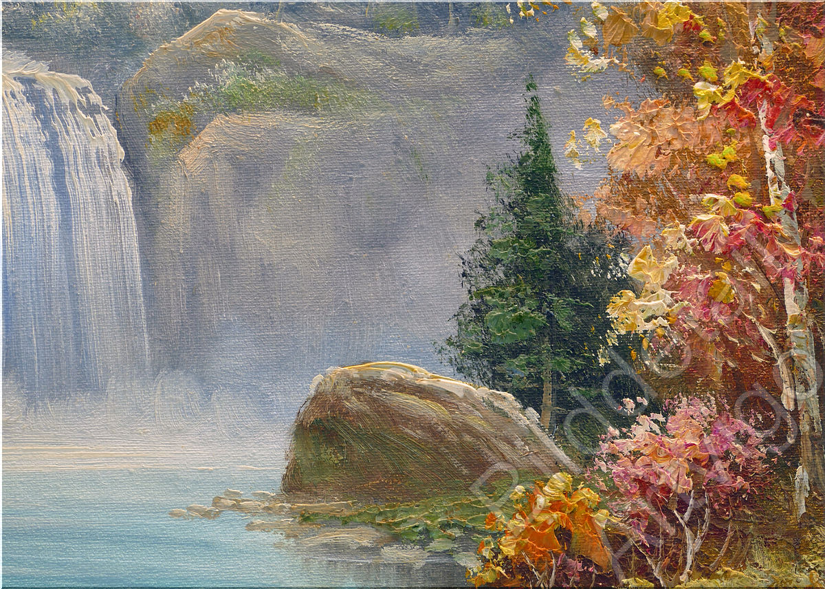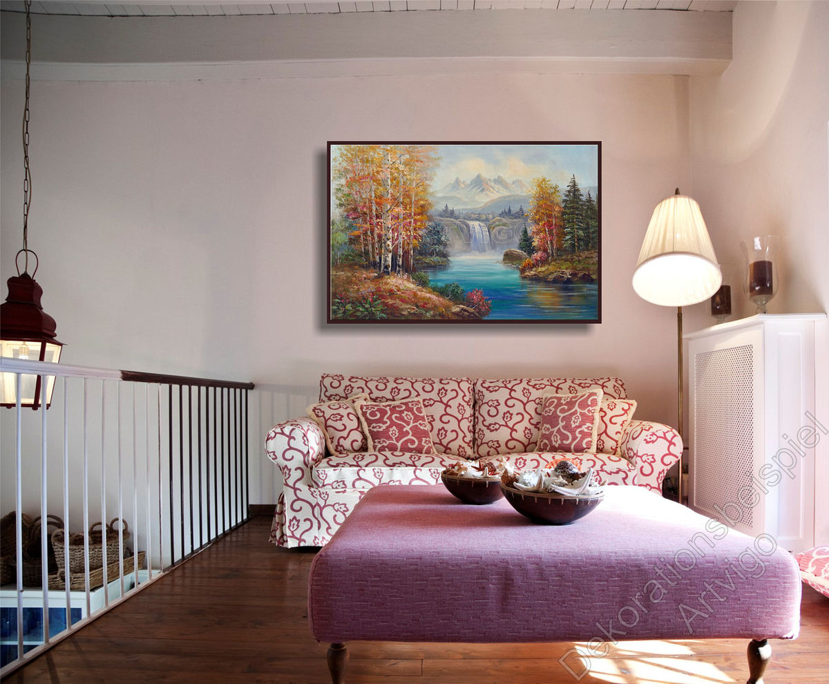 „Herbstzauber am Wasserfall“ ist ein 90 x 60 cm großes Ölgemälde, das die Schönheit der Natur in strahlenden Farben festhält. Leuchtend rote und goldene Herbstbäume rahmen einen klaren Fluss ein, der in einen kraftvollen Wasserfall mündet. Dahinter erheben sich majestätische Berge, die der Szene eine beeindruckende Tiefe verleihen.