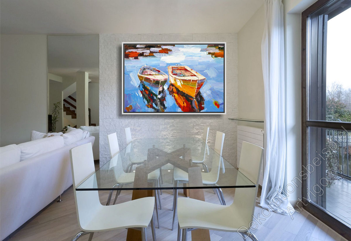 Ein Bild mit viel Ruhe. Zwei kleine Ruderboote im Wasser, liegen auf den leichten Wellen unter einem bedeckten Himmel. Ein abstraktes Gemälde in kühlen Blau, und Grautönen. Das stille Wasser ist lasierend, fast aquarellig gemalt und bildet einen interessanten Gegensatz zu den farbigen Booten, die mit viel Struktur gestaltet wurden. Der Rumpf der Ruderboote spiegelt sich schön im Wasser, Ruder liegen im Boot und die Festmacherleine weist zum Betrachter. Das Bild eignet sich besonders, um in einer dezent eingerichteten Wohnung einen interessanten, markanten Einrichtungsakzent zu setzen. Der kühle Kontrast in dem abstrakten Gemälde bringt Ruhe und Harmonie in ein Wohnzimmer, ein Schlafzimmer oder ein Büro.