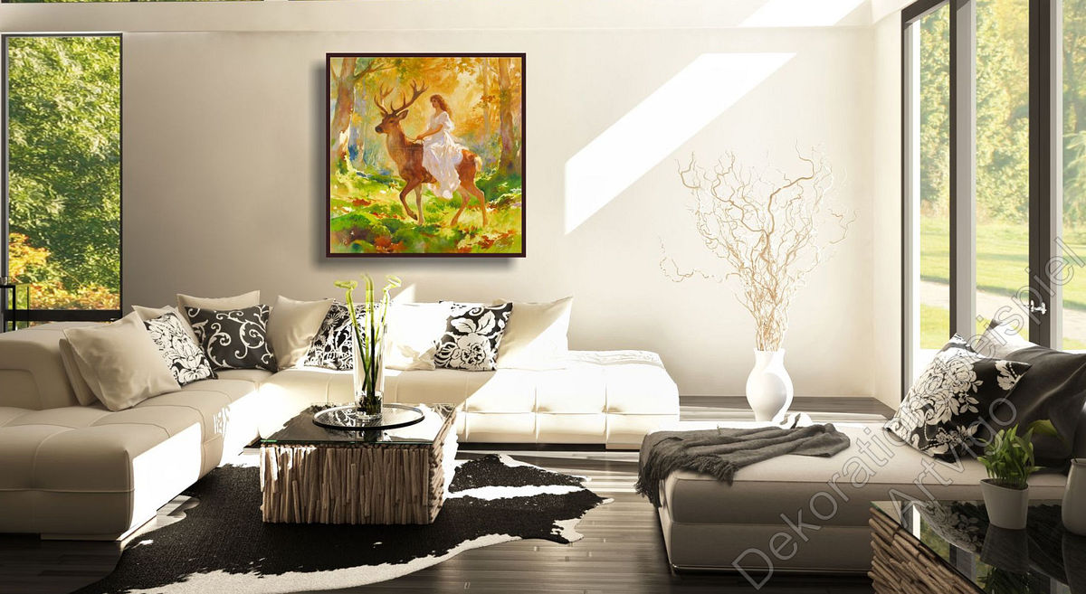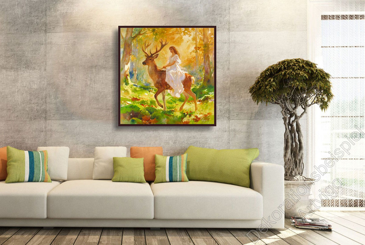 Künstlerischer Hintergrund: Elenor Brey - "Waldzauber" - Märchenhaftes Ölgemälde - Frau auf Hirsch - 90x90 cm