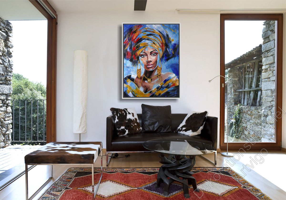 Dieses ausdrucksstarke Ölgemälde zeigt das Porträt einer afrikanischen Frau mit direktem, selbstbewusstem Blick. Umrahmt von einem farbenprächtigen Kopfschmuck entfaltet sich ein kraftvolles Zusammenspiel aus Blau-, Gold-, Rot- und Schwarztönen. Die dynamische Pinselführung verleiht dem Werk eine lebendige Bewegung, während das Gesicht ruhig und klar modelliert ist. Goldene Akzente in Schmuck und Gewand setzen leuchtende Highlights und unterstreichen Würde und Stärke der dargestellten Figur. Der abstrakte Hintergrund verstärkt die emotionale Tiefe und lässt das Porträt nahezu aus der Leinwand hervortreten. Das Werk verbindet zeitgenössische Porträtkunst mit kultureller Symbolik und strahlt Eleganz, Stolz und Sinnlichkeit aus. Der direkte Blick der Frau zieht den Betrachter sofort in den Bann und vermittelt Selbstbewusstsein, Würde und emotionale Tiefe.