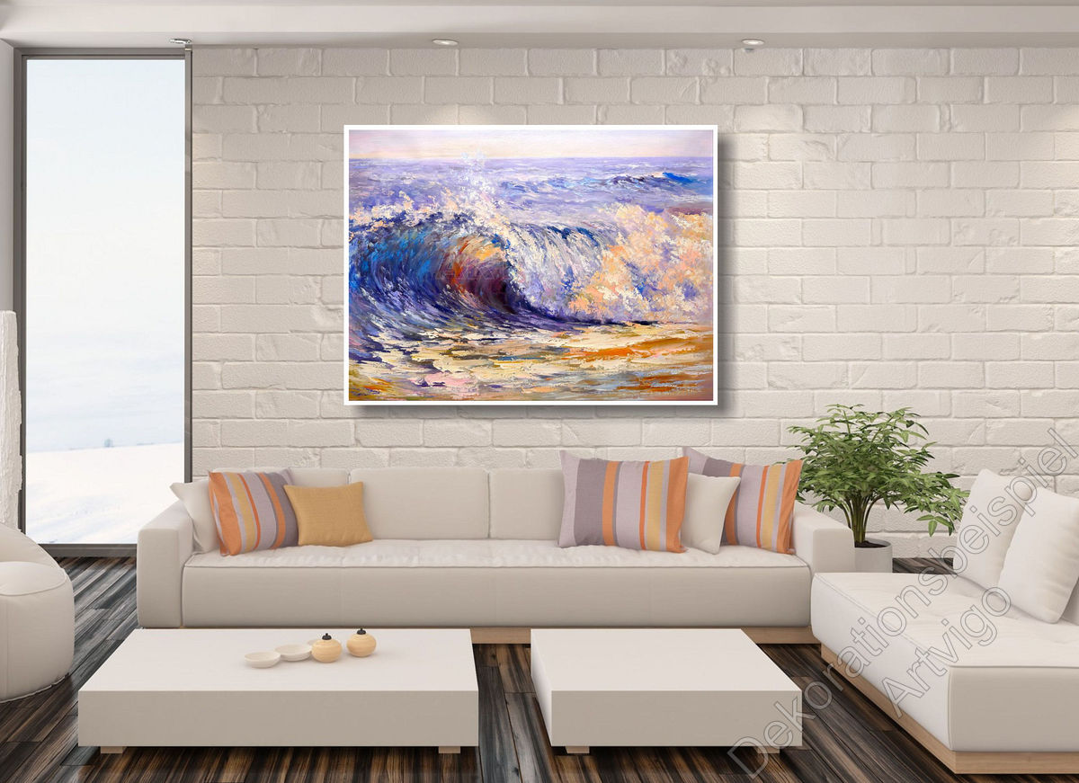 Dieses ausdrucksstarke Ölgemälde fängt den dramatischen Moment einer sich brechenden Meereswelle ein. Die dynamische Komposition zeigt eine kraftvolle Welle im Augenblick ihres Zusammenbruchs, wobei die Gischt in einem spektakulären Spiel aus Licht und Bewegung explodiert. Die Farbpalette reicht von tiefen Blautönen über leuchtende Violett- und Rosanuancen bis hin zu warmen Gold- und Ockertönen, die das Sonnenlicht im Wasser reflektieren. Der Künstler verwendet expressive Pinselstriche und pastos aufgetragene Farbe, um die Textur und Energie des Wassers spürbar zu machen. Der Horizont in zartem Rosa-Lila schafft eine atmosphärische Tiefe, während der Vordergrund mit seinen erdigen Tönen die Verbindung zwischen Meer und Strand herstellt. Das 75 x 100 cm große Werk vermittelt pure Naturgewalt und maritime Schönheit.