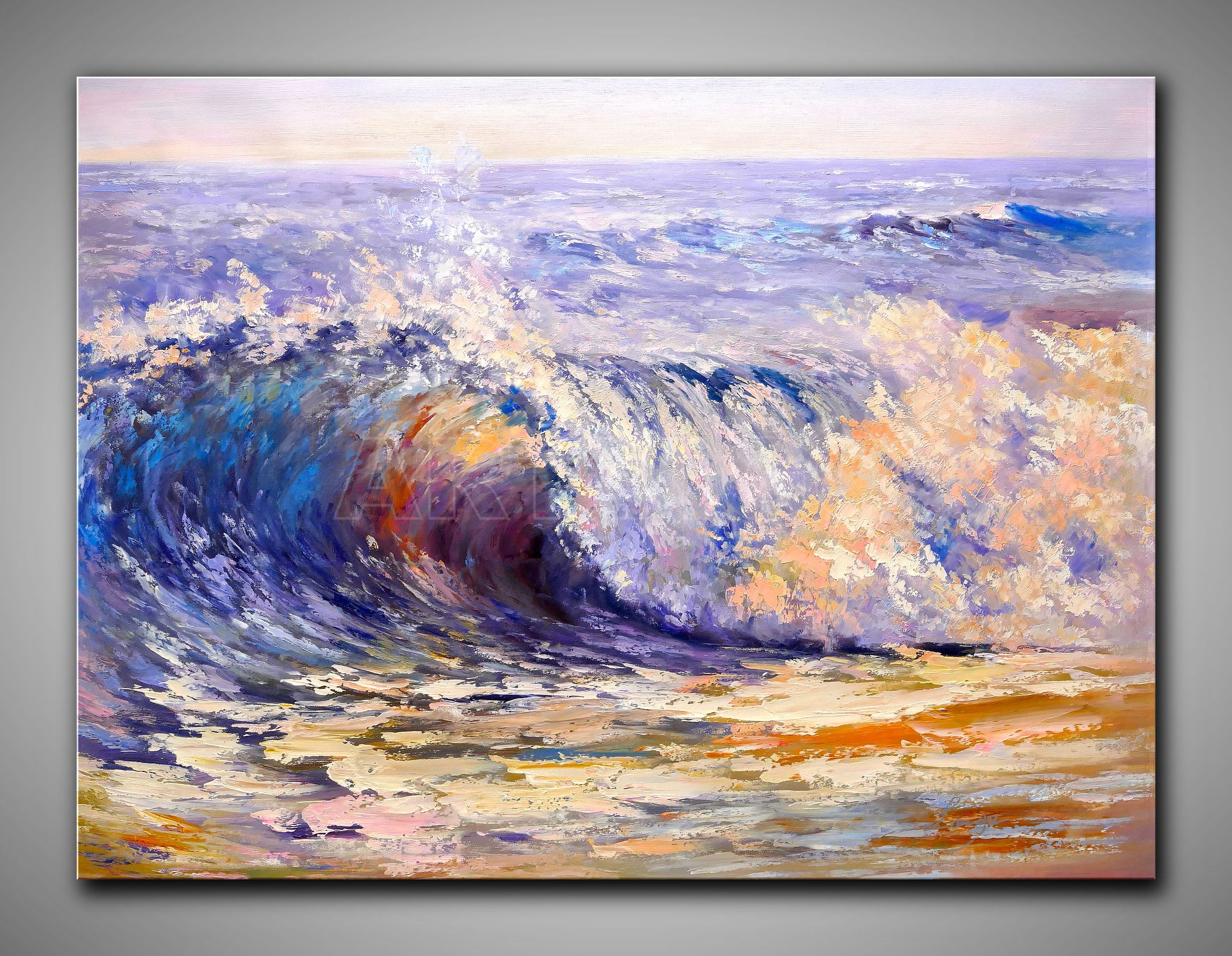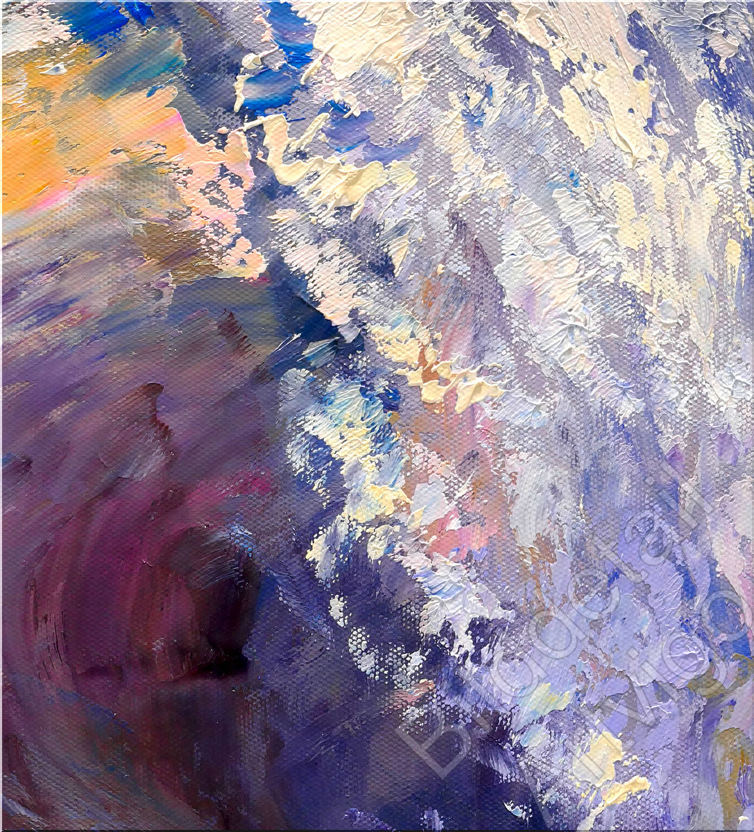 Das Werk folgt der Tradition impressionistischer Meeresmalerei, interpretiert diese jedoch mit zeitgenössischer Expressivität neu. Die pastose Maltechnik erzeugt eine haptische Qualität, die das Gemälde nahezu dreidimensional erscheinen lässt. Besonders bemerkenswert ist die Balance zwischen kontrollierter Komposition und spontaner Gestik – die Welle besitzt strukturelle Klarheit, während die Gischt in abstrahierter Auflösung gezeigt wird. Die unkonventionelle Farbwahl mit Violett-, Rosa- und Goldtönen hebt sich von traditionellen Meeresdarstellungen ab und verleiht dem Werk eine träumerische, fast mystische Qualität. Die energiegeladenen Pinselstriche vermitteln nicht nur die visuelle, sondern auch die kinetische Erfahrung des Meeres.