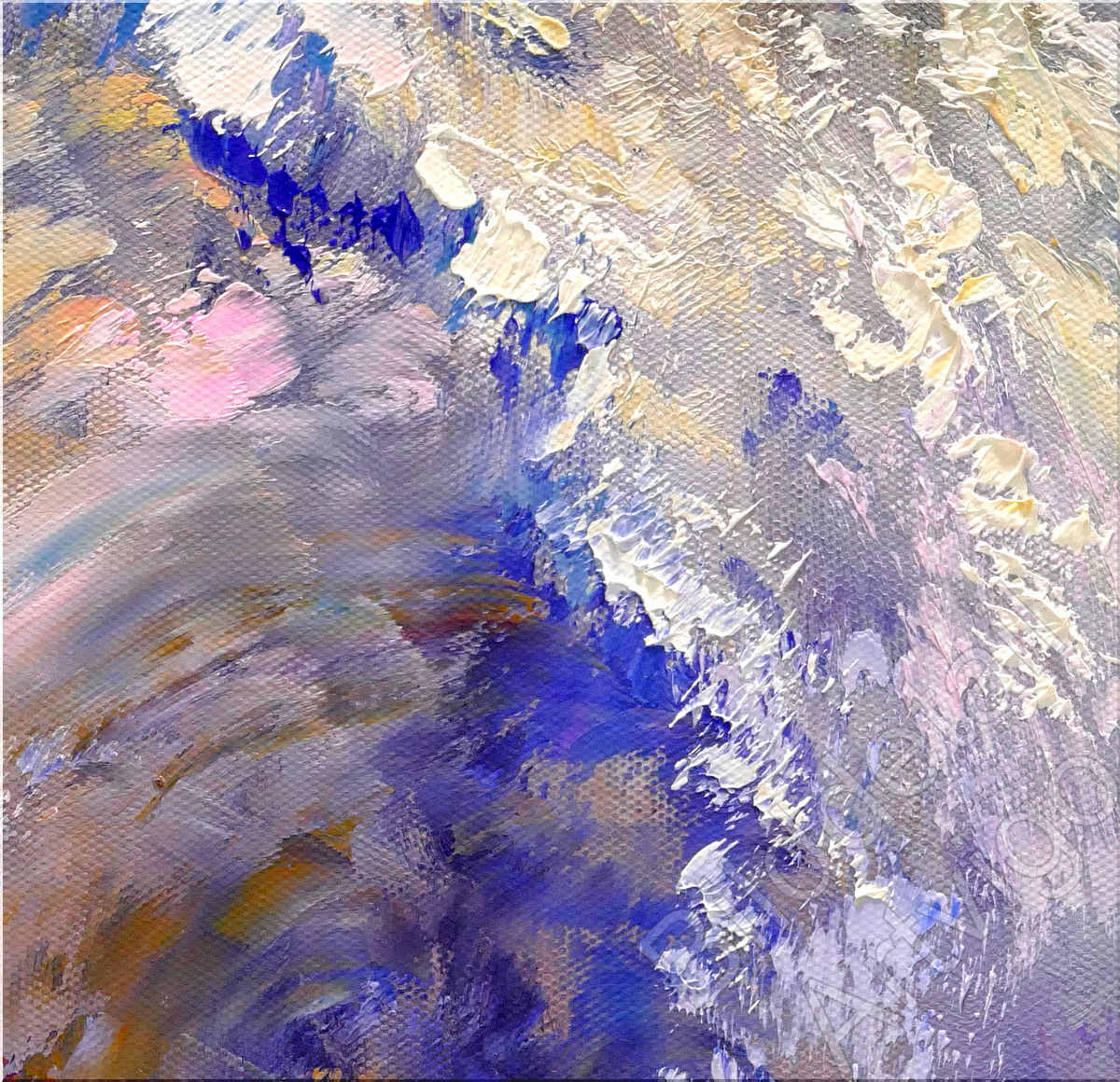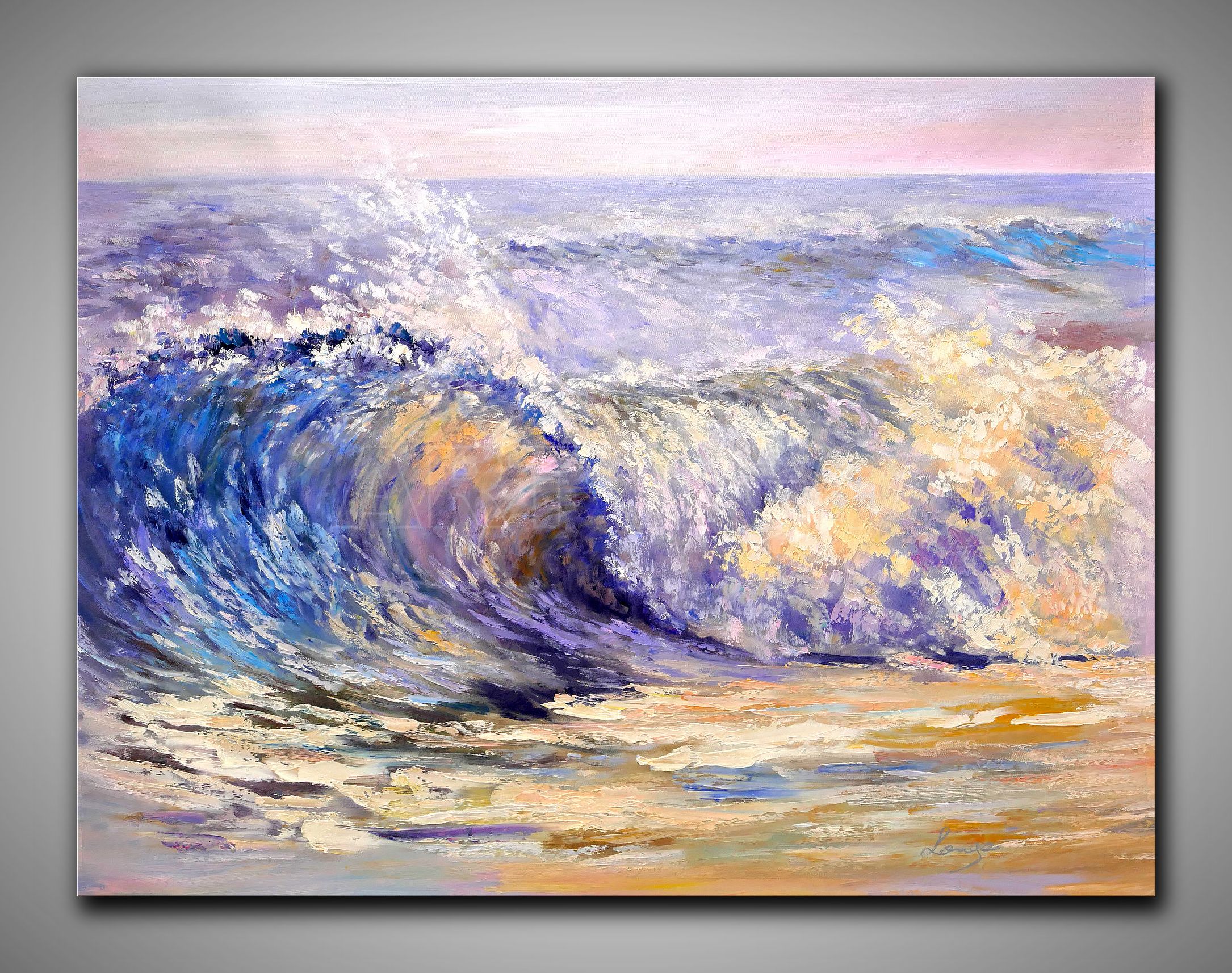 Das Werk folgt der Tradition impressionistischer Meeresmalerei, interpretiert diese jedoch mit zeitgenössischer Expressivität neu. Die pastose Maltechnik erzeugt eine haptische Qualität, die das Gemälde nahezu dreidimensional erscheinen lässt. Besonders bemerkenswert ist die Balance zwischen kontrollierter Komposition und spontaner Gestik – die Welle besitzt strukturelle Klarheit, während die Gischt in abstrahierter Auflösung gezeigt wird. Die unkonventionelle Farbwahl mit Violett-, Rosa- und Goldtönen hebt sich von traditionellen Meeresdarstellungen ab und verleiht dem Werk eine träumerische, fast mystische Qualität. Die energiegeladenen Pinselstriche vermitteln nicht nur die visuelle, sondern auch die kinetische Erfahrung des Meeres.