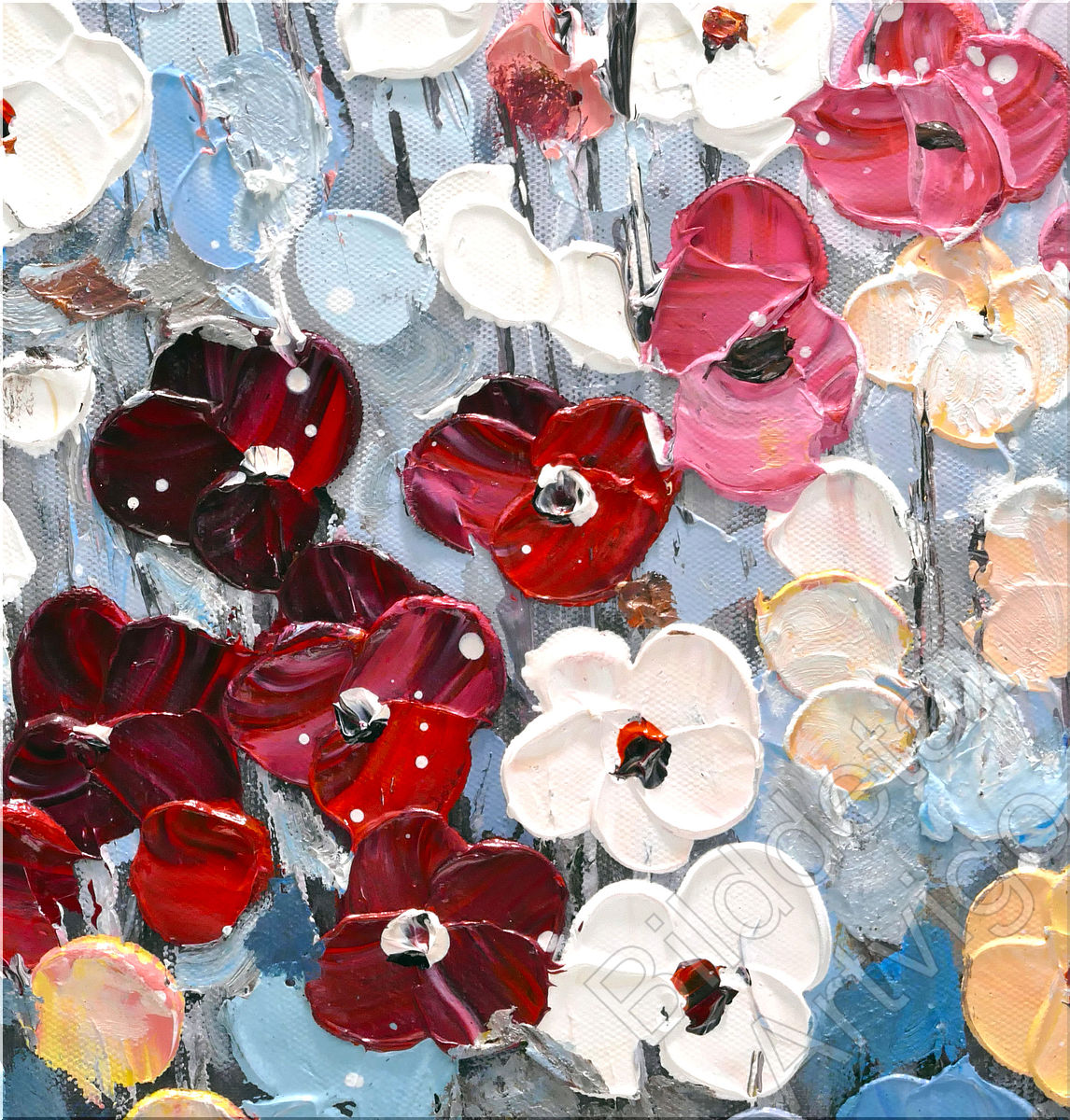 Dieses großformatige Ölgemälde (150 x 75 cm) fängt die unbeschwerte Leichtigkeit eines Sommertages am Meer ein. Im Vordergrund erblüht ein dichtes Meer aus abstrakten Blüten in Weiß, kräftigem Rot, sanftem Rosa und sonnigem Gelb. Der Künstler nutzt eine dynamische Spachteltechnik, die den Blüten eine haptische Dreidimensionalität verleiht. Die vertikalen Pinselstriche der Stängel geben dem Werk Struktur und leiten den Blick nach oben, wo sich das Blumenfeld sanft mit dem tiefblauen Horizont des Ozeans vermischt. Der weite, lichtdurchflutete Himmel rundet die Komposition ab. Ein Werk voller Vitalität, das Frische und maritime Eleganz in jeden Raum bringt.