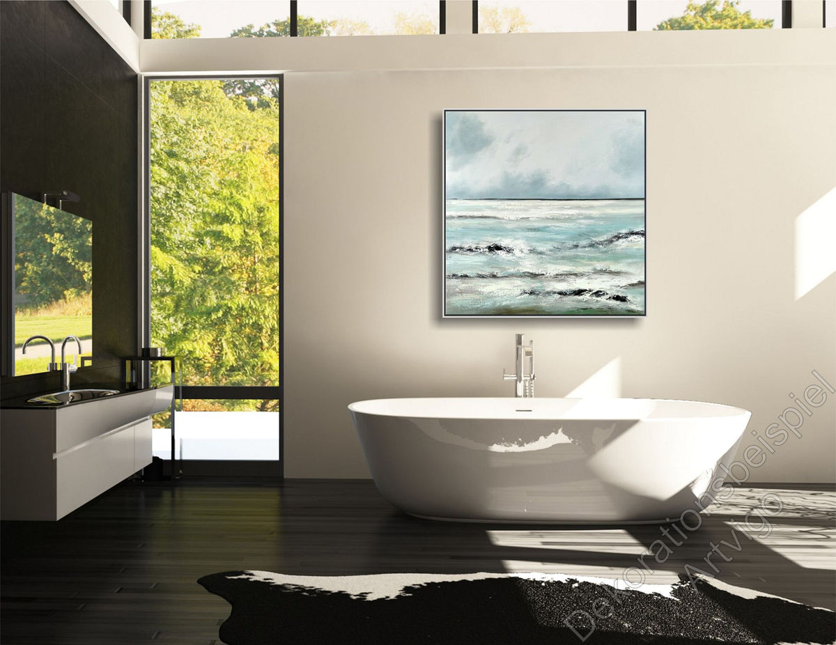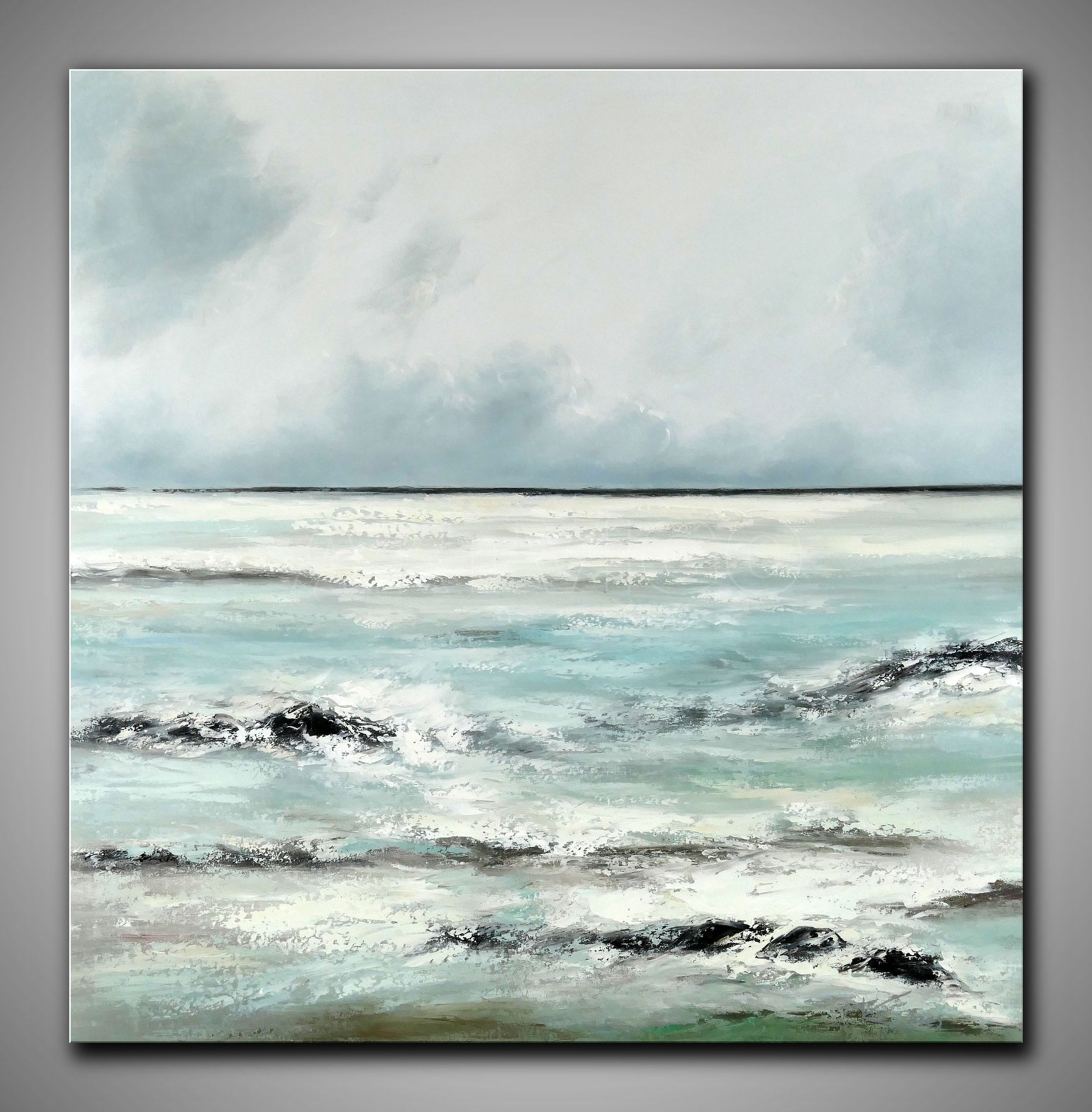 Dieses quadratische Ölgemälde im Format 100 x 100 cm fängt die kraftvolle und zugleich meditative Atmosphäre einer rauen Küstenlandschaft ein. Im Zentrum stehen die sanft auslaufenden Wellen, die mit pastosem Farbauftrag in Weiß und Türkis auf die Leinwand gebracht wurden. Die Gischt bricht sich an dunklen, abstrakt angedeuteten Felsformationen, die dem Bild Tiefe und Erdung verleihen. Über dem weiten, hellen Horizont spannt sich ein wolkenverhangener Himmel in nuancierten Grau- und Weißtönen auf, der die kühle Frische des Nordens atmet. Durch die strukturierte Spachteltechnik erhält das Wasser eine lebendige Dynamik, die den Betrachter förmlich das Salz in der Luft spüren lässt – ein zeitloses Werk, das Ruhe und Weite in jeden Raum bringt.