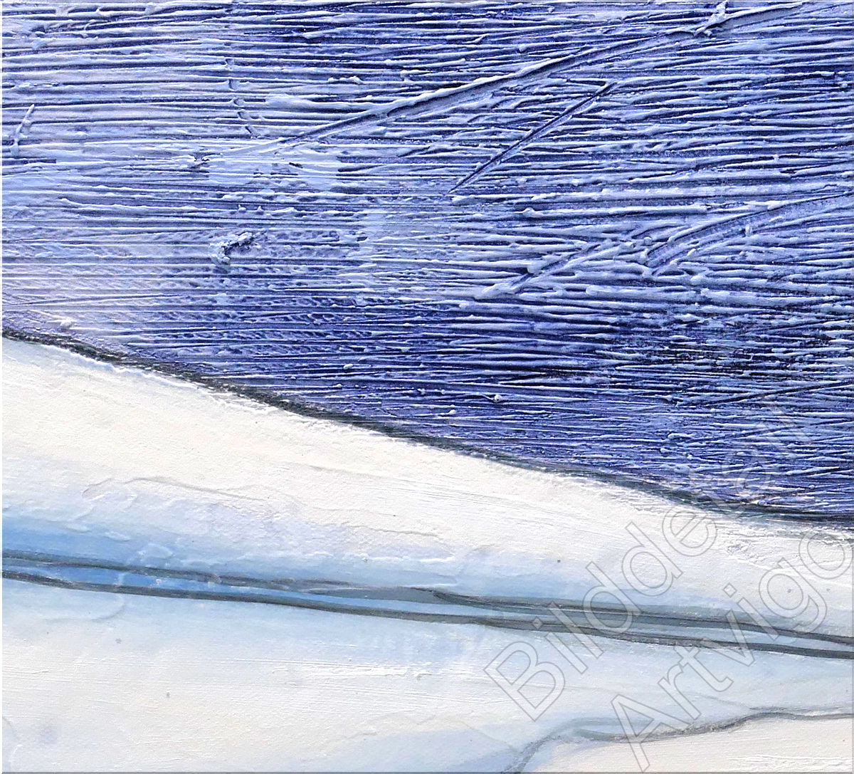 Ein Haifisch in einer künstlerischen Darstellung. Wer den Anblick von einem Hai im Meer schon einmal erlebt hat wird diesen Anblick nicht so schnell vergessen. Diese Scene, mit der Farbe des Wassers und der Haifischhaut, ist von dem Künstler in einer ungewöhnlichen Malweise sehr schön eingefangen. Die stark aufgespachtelten Farben bringen Leben und Ausdruck in das Gemälde. Mit starkem Farbauftrag in Öl gemalt.