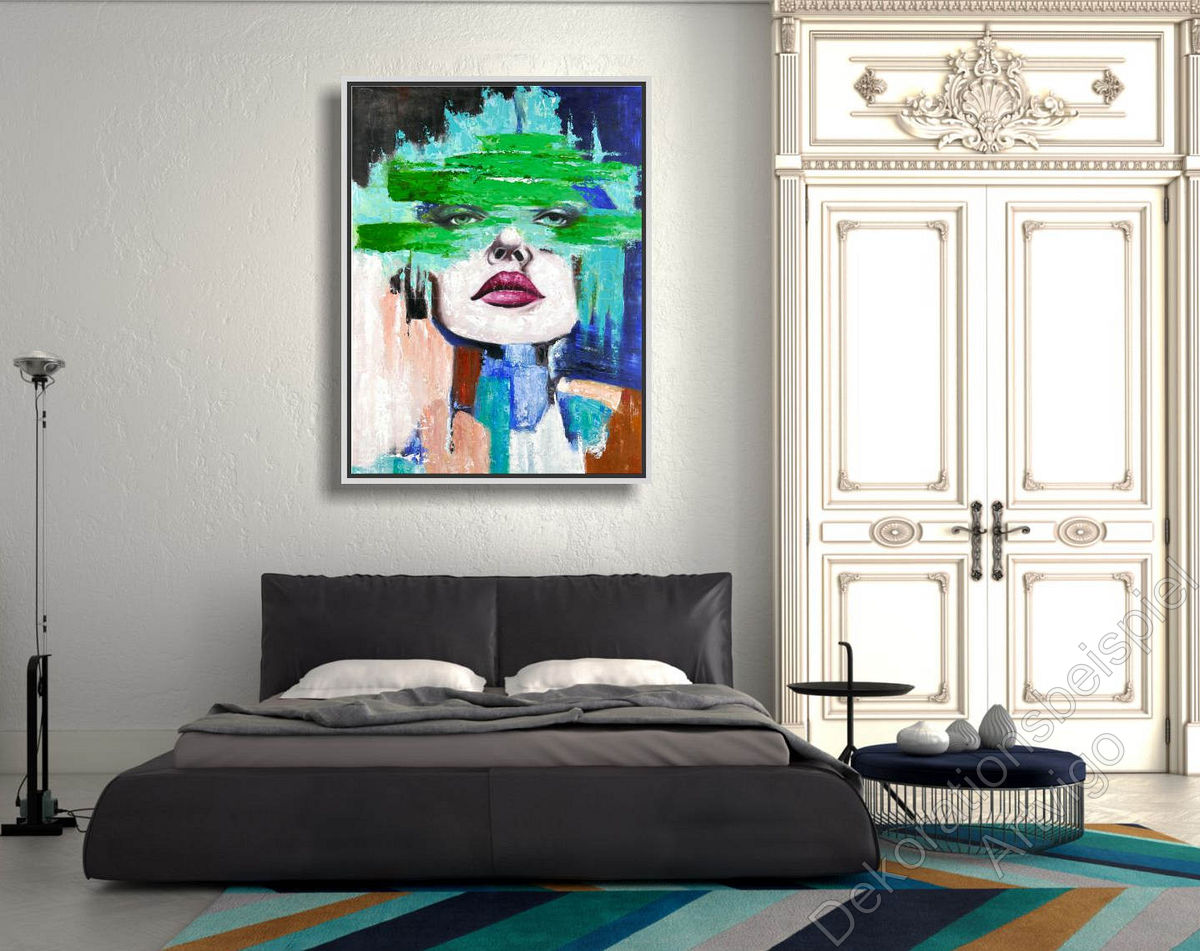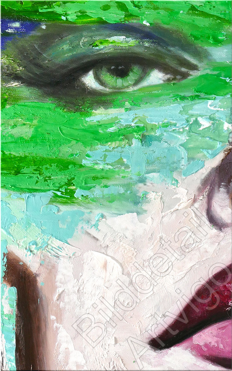 Ein Gesicht in stark abstrakter Darstellung. Das Portrait ist in bunten, nicht natürlichen Farbigkeiten gemalt. Die bestimmenden Farben sind Blau, Türkis und Rot. Das Gemälde wurde teilweise sehr strukturiert mit dickem Farbauftrag gespachtelt und erinnert an Pop-Art.