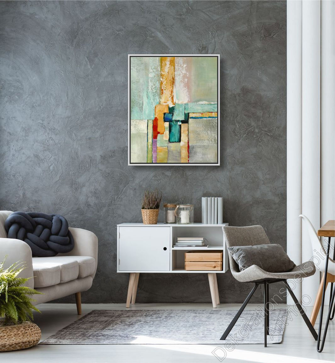 Die Farbpalette ist raffiniert abgestimmt: Die kühlen Mint- und Türkistöne werden durch warme Gelb-, Orange- und Rottöne perfekt ausbalanciert, wodurch das Bild weder zu kühl noch zu warm wirkt, sondern eine harmonische Gesamtstimmung erzeugt. Das Gemälde strahlt mediterrane Leichtigkeit aus, erinnert an sonnenbeschienene Hausfassaden, Fenster zum Meer oder abstrakte urbane Strukturen. Es ist gleichzeitig modern und zeitlos.
